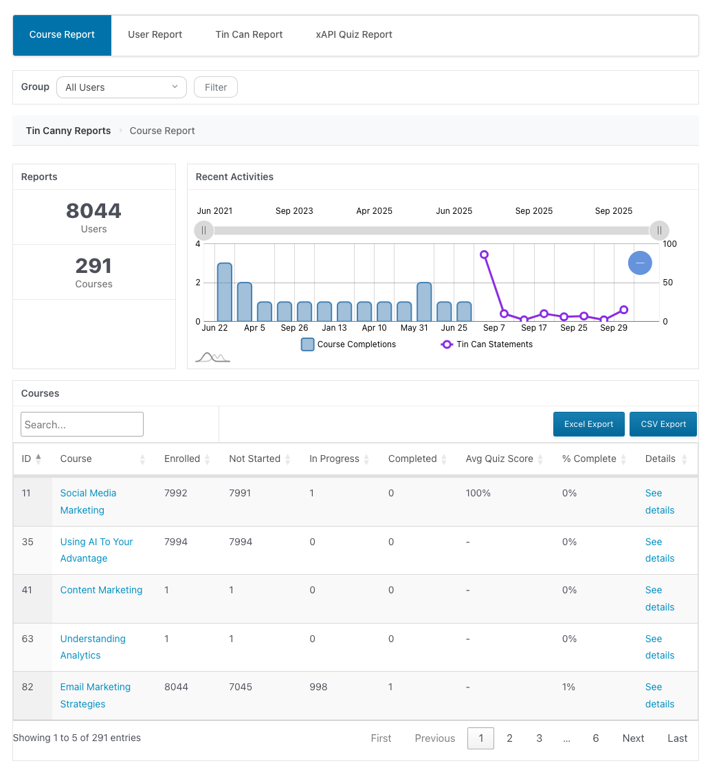 Simply add that shortcode to any page and the full course and user report will be available to permitted users. When setting up a page for the Tin Canny reports, we _strongly_ recommend that you add it to a full-width page (the tables are very wide and sidebars will interfere) and that you not having anything else on the page.